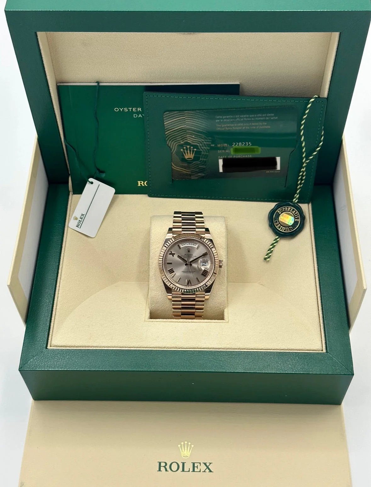 NEW 2023 Rolex Day-Date 40mm 228235 Presidential Rose Gold Sundust Dial